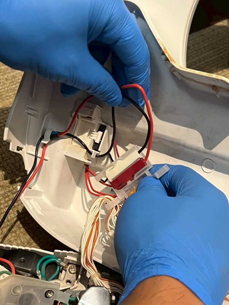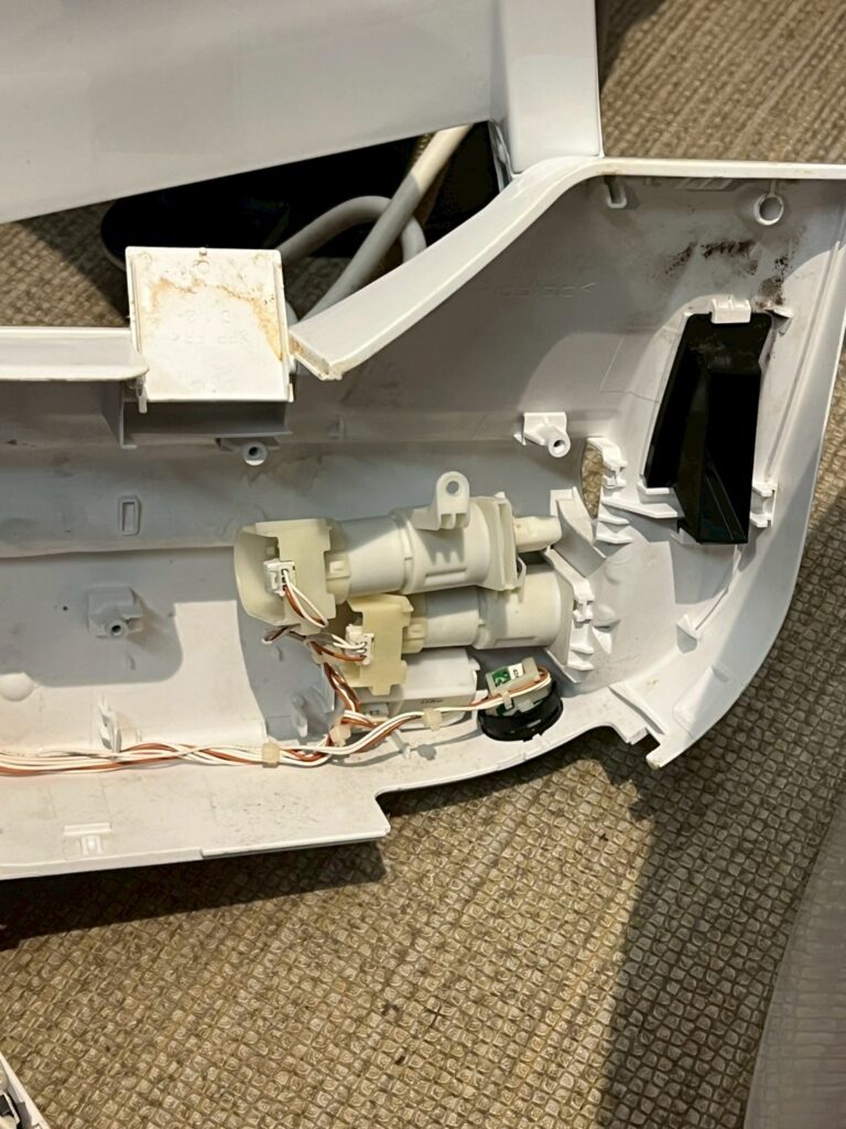 便座に繋がる3つのコネクタを、ロック爪を押さえながらまっすぐ引き抜きます。無理な力は禁物です。 - 新しい便座ユニットを仮置き: